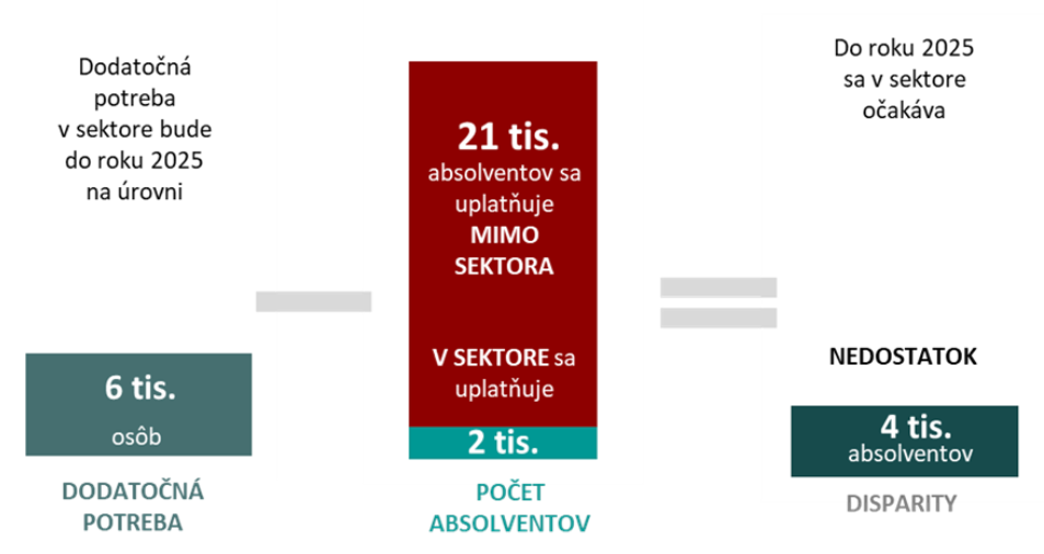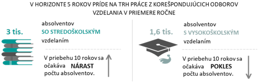 V období rokov 2021 – 2025 príde na trh práce 22,8 tisíc absolventov stredných a vysokých škôl, ktorí ukončia štúdium v niektorom z korešpondujúcich odborov vhodných pre výkon zamestnaní v tomto sektore a nebudú pokračovať v štúdiu. Približne 66 % z prichádzajúcich absolventov budú tvoriť absolventi stredných škôl, podiel absolventov vysokých škôl bude na úrovni 34 %. V dlhšom horizonte, v nasledujúcich 10 rokoch sa očakáva nárast počtu stredoškolských absolventov.