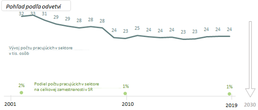 V súčasnosti pracuje v sektore o 25 % menej osôb ako pred 20 rokmi a na celkovej zamestnanosti SR sa podieľa 1 %. Od roku 2001 poklesol tento podiel o 1 p. b. Priemerný medziročný pokles zamestnanosti v sektore je na úrovni 2 %. Najvyšší medziročný pokles počtu pracujúcich za posledných 20 rokov zaznamenal sektor v roku 2009 (o 14 %). Do roku 2030 sa očakáva pokles počtu pracovných síl. Najväčšími zamestnávateľmi v sektore sú U. S. Steel Košice, s.r.o., Železiarne Podbrezová a.s. (ďalej len „ŽP a.s.“) a Bekaert Hlohovec, a.s., ktorí zamestnávajú 62 % zamestnancov sektora.