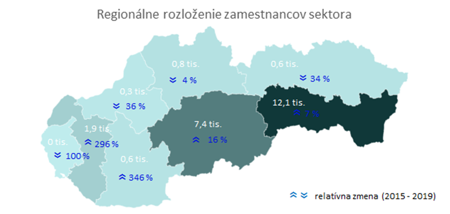 Až 51 % zamestnancov sektora pracuje v Košickom kraji, kde má sektor 7 % podiel na celkovej zamestnanosti. Spolu s Banskobystrickým a Trnavským krajom tvoria 87 % zamestnanosti sektora. Sektor hutníctvo, zlievarenstvo, kováčstvo sa najrýchlejšie rozvíja v Nitrianskom kraji, kde za posledných 5 rokov vzrástol počet zamestnancov o 346 %. Najnižší počet zamestnancov sektora je v Bratislavskom kraji.