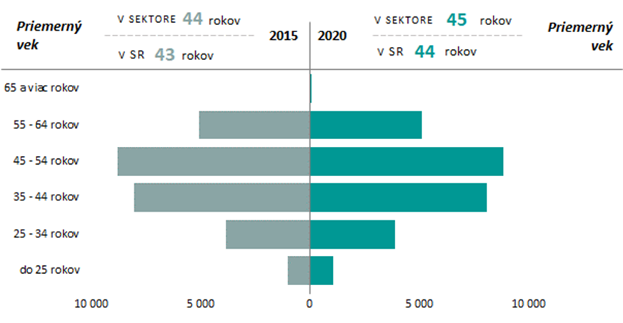 Z hľadiska veku zamestnancov patrí sektor medzi mladšie sektory. Vyšší priemerný vek majú zamestnanci v 50 % sektorov. Priemerný vek zamestnancov v sektore je o 1 rok vyšší ako v SR. V celej SR má 24 % zamestnancov 55 a viac rokov, v sektore je ich podiel na úrovni 21 %. Ak sektor definujeme podľa sektorových zamestnaní, priemerný vek zamestnancov je nižší, na úrovni 44 rokov.