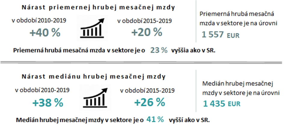 Za uplynulých 10 rokov vzrástli mzdy o 40 %, čo predstavuje 9 %-ný priemerný medziročný rast. Rast miezd v sektore tak vykazuje nižšiu dynamiku ako v podmienkach SR. V zahraničných spoločnostiach v sektore sú mzdy o 56 % vyššie ako v tuzemských.