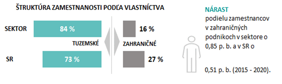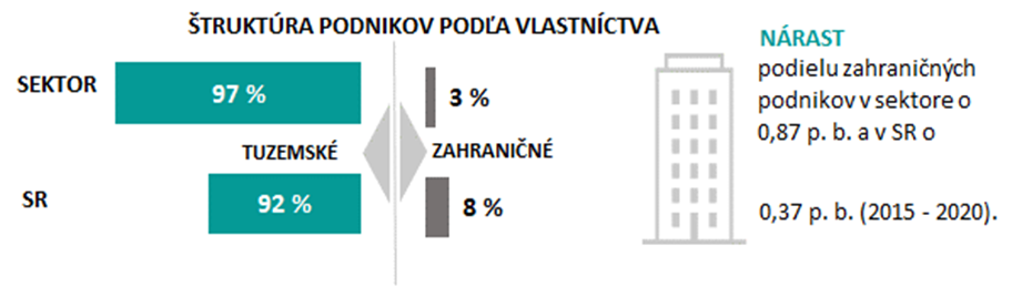 V sektore dominujú tuzemské podniky s 97 %-ným zastúpením a 84 %-ným podielom na zamestnanosti sektora. V sektore tak pracuje menšia časť zamestnancov v zahraničných podnikoch na území SR ako v slovenských podnikoch. V porovnaní s rokom 2015, podiel zahraničných podnikov v sektore vzrástol o 0,9 p. b. a záujem zahraničných investorov rastie.