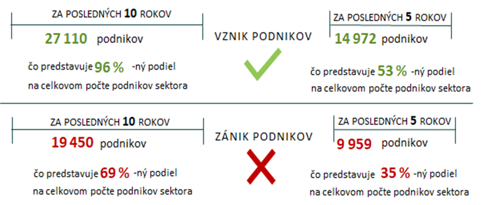 Za posledných 5 rokov pripadalo na 100 existujúcich podnikateľských subjektov 53 novovzniknutých a 35 zaniknutých podnikateľských subjektov. V dlhodobom horizonte dynamika vzniku podnikateľských subjektov rastie a rastie aj počet zaniknutých podnikov. V porovnaní so SR sa sektor vyznačuje nižšou dynamikou vzniku a vyššou dynamikou zániku podnikateľských subjektov. Prevažnú časť vzniknutých aj zaniknutých podnikateľských subjektov predstavujú fyzické osoby – podnikatelia (84 %).