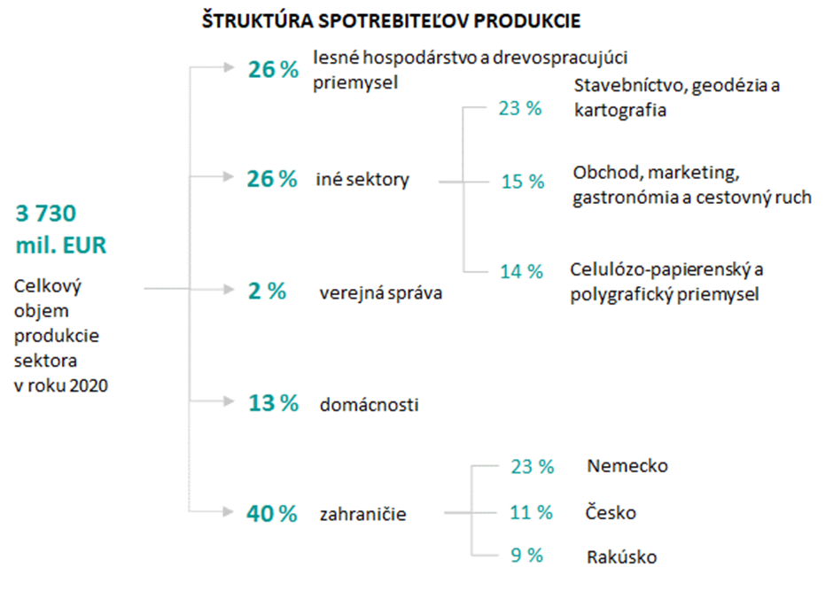 Najdominantnejšou kategóriou spotrebiteľov produkcie je zahraničie so 40 % podielom na celkovej spotrebe produkcie sektora. Do zahraničia smeruje 40 % produkcie, z toho je 54 % vstupom do ďalšieho výrobného procesu v zahraničí. Sektor tak produkuje 8 % pre domácu finálnu spotrebu, 18 % pre finálnu spotrebu v zahraničí, 53 % pre domácu medzispotrebu a 21 % pre medzispotrebu v zahraničí. Hlavnými spotrebiteľmi produkcie v zahraničí sú Nemecko, Česko a Rakúsko.