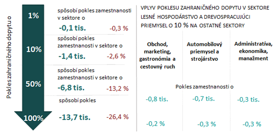 Zamestnanosť sektora lesné hospodárstvo a drevospracujúci priemysel závisí od dopytu po tovaroch a službách nielen tohto sektora, ale aj zahraničia a ostatných sektorov. Pokles finálneho zahraničného dopytu po tuzemských produktoch sektora o 10 % spôsobí pokles zamestnanosti v sektore o 2,6 %, čo predstavuje pokles približne o 1,4 tisíc zamestnancov. Poklesom dopytu sú však nepriamo ovplyvnené aj subdodávateľské sektory, predovšetkým sektory obchod, marketing, gastronómia a cestovný ruch a automobilový priemysel a strojárstvo.