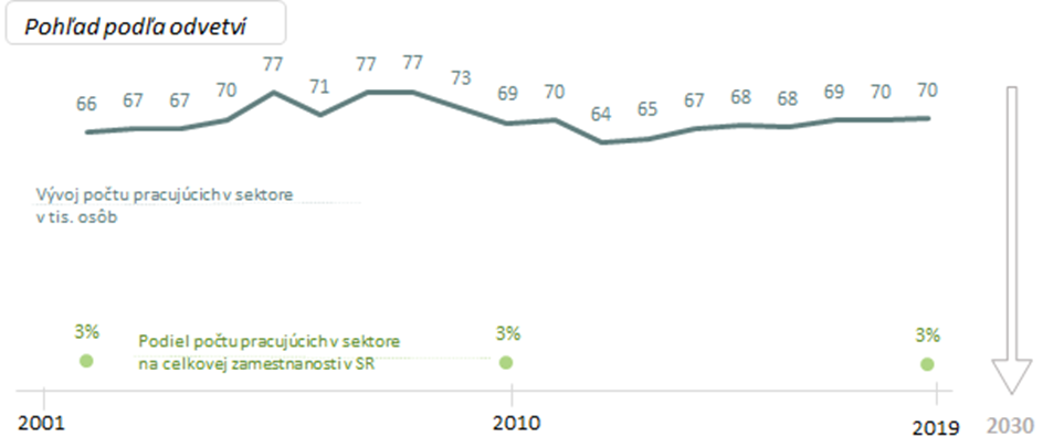 Úroveň počtu pracujúcich vo veľkej miere závisí aj od toho, ako sektor definujeme. Graf vyjadruje vývoj počtu pracujúcich pri definovaní sektora podľa prevažujúcej ekonomickej činnosti. Sektor však môžeme definovať aj podľa typických sektorových zamestnaní. V takomto prípade je celkový počet pracujúcich v sektore na úrovni 44 tisíc osôb, čo je o 37 % menej ako pri odvetvovej agregácii a ich počet vzrástol od roku 2015 o 3 %.