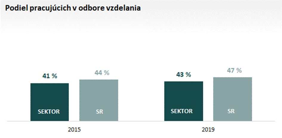 Podiel pracujúcich v odbore vzdelania zo zamestnancov v sektore je pod úrovňou priemeru zamestnancov pracujúcich v odbore vzdelania v SR. Približne 43 % zamestnancov sektora vyštudovalo optimálny odbor vzdelania k vykonávanému zamestnaniu. Pri vysokoškolských zamestnancoch v sektore je to 54 % a pri stredoškolských 39 %. Z hľadiska sektorovo špecifických zamestnaní vykonáva približne 51 % zamestnancov prácu, na ktorú sa aj počas štúdia pripravovali.