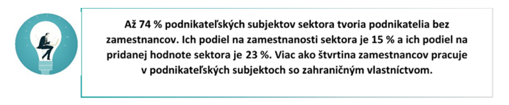 Takmer 99 % podnikateľských subjektov v sektore predstavujú malí podnikatelia do 19 zamestnancov, ktorí tvoria takmer polovicu HDP sektora (47 %) a zamestnávajú viac ako polovicu všetkých zamestnancov v sektore (54 %). V sektore pôsobí 54 zamestnávateľov nad 500 zamestnancov, ktorí spolu tvoria 19 % HDP sektora a 17 % zamestnanosti. Len 11 % podnikateľských subjektov v sektore má zahraničné vlastníctvo. Prevažne ide o väčšie podniky, ktoré zamestnávajú 27 % všetkých pracujúcich v sektore. V sektore je podiel zamestnancov pracujúcich v zahraničných podnikoch na úrovni priemeru SR.