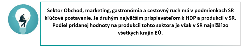 Sektor Obchod, marketing, gastronómia a cestovný ruch tvorí 11 % celkovej produkcie SR, čo je po priemysle druhý najvyšší podiel. Tento podiel však mierne klesá, v roku 2001 bol na úrovni 13,1 %. Dôvodom je predovšetkým nárast dominancie automobilového priemyslu na produkcii SR (kde sa podiel na produkcii za ostatných 20 rokov zdvojnásobil). V roku 2001 mal sektor obchodu vyšší podiel na produkcii ako automobilový priemysel, dnes má polovičný. Približne polovicu produkcie tvorí pridaná hodnota (47 %). Tento podiel v sektore dlhodobo stagnuje a patríme medzi krajiny s najnižším podielom pridanej hodnoty na produkcii v EÚ.