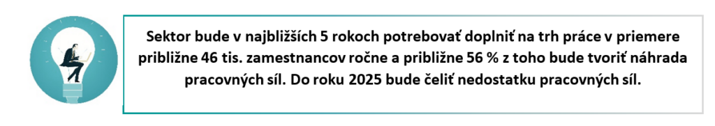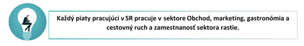 Regenerácia ekonomiky v roku 2022 a neskôr prinesie so sebou aj množstvo nových pracovných miest v tomto sektore. V období rokov 2021 – 2025 bude v sektore potrebných približne 46 tisíc zamestnancov nad rámec v súčasnosti pracujúcich osôb. Približne 56 % pracovných príležitostí bude vytvorených náhradou pracovných síl. Tieto potreby trhu práce sú určené na základe garantovaných zamestnaní Sektorovou radou pre obchod, marketing, gastronómiu a cestovný ruch. Ak zohľadníme členenie podľa odvetví, tak v podnikoch pôsobiacich v sektore budú potreby trhu práce ešte o niečo vyššie na úrovni 51 tisíc osôb. Ide o najvyššie potreby trhu práce v budúcnosti zo všetkých sektorov, čo samozrejme úzko súvisí s tým, že v sektore je aj v súčasnosti najviac pracovných miest. Očakáva sa však, že z absolventov, ktorí prídu na trh práce z korešpondujúcich odborov vzdelania, sa len približne 11 tisíc uplatní v tomto sektore do roku 2025 a aj z týchto dôvodov bude sektor čeliť nedostatku pracovných síl aj v budúcnosti. Najviac pracovných príležitostí v sektore je však vytváraných na pozíciách Predavač v obchodnej prevádzke a Pokladník v predajni, ktoré patria medzi zamestnania s potrebou nižšej kvalifikácie a jednoduchším zaškolením nových pracovníkov do pracovného procesu aj mimo odbor vzdelania. Potreby trhu práce budú tiež vysoké v zamestnaniach ako Kuchár, Pomocník v kuchyni a Čašník, servírka. Uvedených päť zamestnaní bude tvoriť 40 % všetkých potrieb trhu práce sektora do roku 2025.