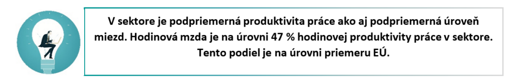 Priemerná hrubá mesačná mzda v sektore je na úrovni 1 124 EUR a je o 11 % nižšia ako v SR. Od roku 2010 vzrástla o 43 %, čo je pomalší rast ako priemer v SR. Mzdy sú ťahané predovšetkým zahraničnými podnikmi, v ktorých je výška mzdy o 52 % vyššia ako v tuzemských. Mzdy v sektore patria v SR medzi najnižšie v Európe (nižšie sú len v Maďarsku, Poľsku, Grécku, Portugalsku a na Cypre). V priemere vyprodukuje zamestnanec za rok 23 tisíc EUR pridanej hodnoty, čo je takmer o tretinu menej ako priemer v SR, ako aj výrazne pod priemernou produktivitou sektora v EÚ. Produktivita sektora v SR je štvornásobne nižšia ako napríklad v Luxembursku. Výška mzdy sa vo veľkej miere odvíja práve od produktivity práce a v krajinách EÚ tvorí priemere 48 % produktivity práce. V SR je tento podiel na úrovni 47 %. Podiel miezd na produktivite práce je tak na úrovni priemeru, problémom je však podpriemerná produktivita práce v SR, v dôsledku čoho sú v SR aj podpriemerné mzdy.