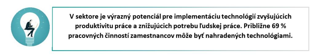 Približne dve tretiny pracovných miest v sektore možno charakterizovať vysokým rizikom nahradenia technológiami v najbližších 20 rokoch. Celkovo bude možné nahradiť technológiami 69 % pracovných činností v súčasnosti vykonávaných zamestnancami. Medzi zamestnania s najväčším rizikom nahradenia technológiami patria práve dve najpočetnejšie zamestnania sektora a to Predavač v obchodnej prevádzke a Pokladník v predajni. To, že nejaká činnosť môže byť nahradená technológiou ešte neznamená, že aj bude. A ak bude nahradená technológiou, to ešte neznamená zánik pracovného miesta a prepustenie zamestnanca. Základné trhové princípy a zisková motivácia podnikov bude v skutočnosti brániť tomu, aby automatizácia a robotizácia mali extrémny nárazový vplyv na trh práce a zamestnancov a prechod na nové technológie bude v dlhodobom horizonte kontinuálny a plynulý.