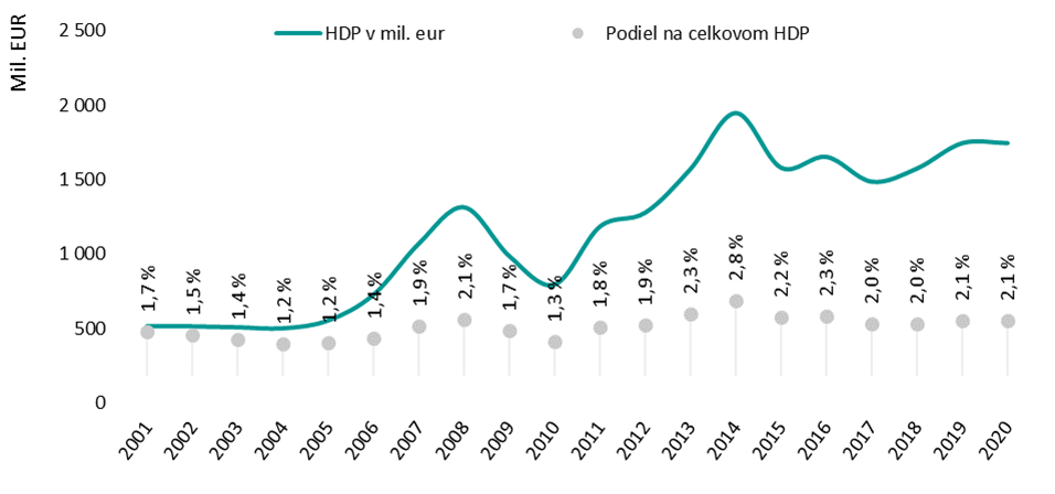 Sektor mal v roku 2020 2,1 %-ný podiel na tvorbe HDP v SR a tento podiel z dlhodobého pohľadu mierne rastie. Vývoj HDP sektora je uvedený v Grafe č. 1.