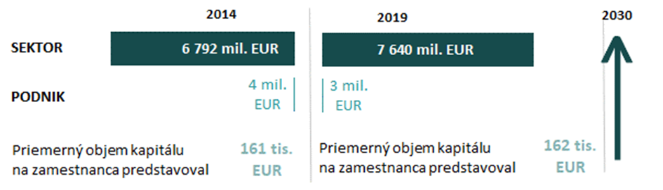Podniky v sektore disponujú priemerným kapitálom na jedného zamestnanca na úrovni 162 tisíc EUR. Dlhodobý hmotný majetok z toho tvorí 94,8 %. Z hľadiska špecifických kapitálových položiek tvoria 28,8 % budovy a stavby, 55,4 % stroje a hnuteľné veci a 1,2 % softvérové vybavenie. Sektor má podpriemernú potrebu kapitálu na zamestnanca (o 72% nižšiu ako priemer v SR) a patrí medzi 46 % sektorov s najnižšou kapitálovou náročnosťou produkcie. Keďže objem kapitálu na zamestnanca rastie, rastie aj jeho dôležitosť v produkčných procesoch. Tento rast je menej výrazný ako v hospodárstve SR a je nižší ako v 86 % sektorov.