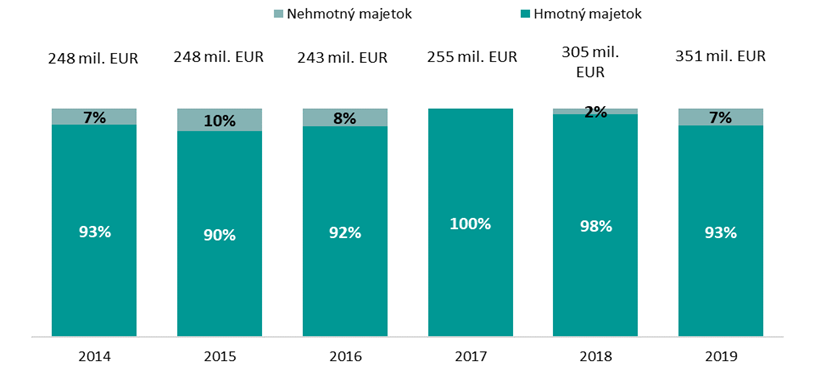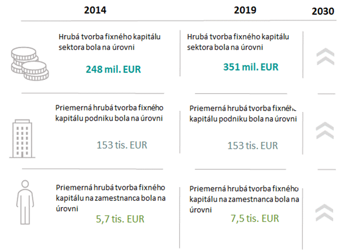 Podniky v sektore investovali v roku 2019 rovnako ako pred piatimi rokmi. Na jedného zamestnanca pripadali investície vo výške 7,5 tisíc EUR, čo je o 10 % menej ako na národnej úrovni. Sektor tak má podpriemernú dynamiku investičnej aktivity. Investície v sektore tvoria 2 % investičnej aktivity v SR. 93 % investícií smeruje do hmotného majetku. Hlavnou investičnou položkou sú stroje a hnuteľné veci.