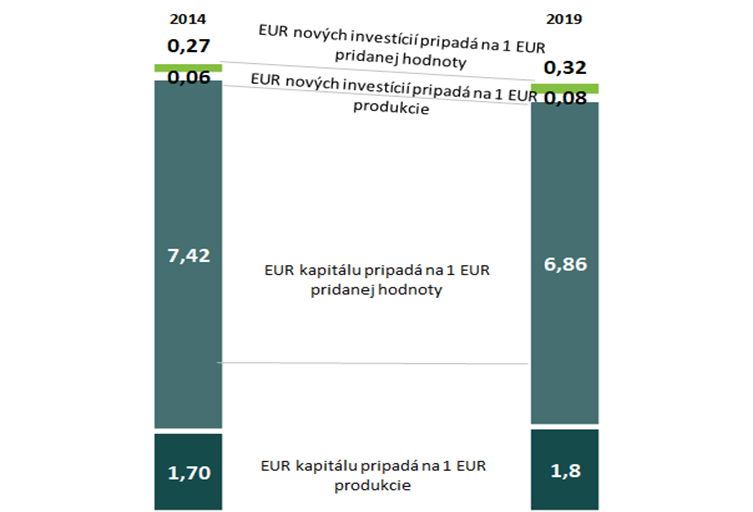 Podniky v sektore potrebujú v priemere kapitál na úrovni 1,8 EUR na tvorbu jedného eura produkcie a 6,86 EUR na tvorbu jedného eura pridanej hodnoty. Klesajúci trend tohto ukazovateľa hovorí o klesajúcom podiele kapitálu na výrobnom procese spoločností, ale súčasne hovorí aj o zvyšujúcej sa produktivite kapitálu (t. j. jednotka kapitálu v minulosti prinášala menší príspevok k tvorbe pridanej hodnoty ako v súčasnosti). Z každého eura realizovanej produkcie používajú spoločnosti na ďalšie investície približne 8 centov (8 %) a na každé euro pridanej hodnoty prislúcha približne 32 centov nových investícií.
