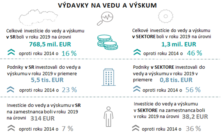 V roku 2019 investovali podniky v sektore do vedy a výskumu 1,3 mil. EUR. V porovnaní s ostatnými sektormi však patrí sektor potravinárstvo medzi sektory s podpriemernými investíciami do vedy a výskumu a tvorí len 0,2 % celkových výdavkov do vedy a výskumu v SR. Priemerné výdavky na vedu a výskum na podnik rastú v sektore rýchlejšie ako v SR. V roku 2019 investoval sektor oproti roku 2014 do vedy a výskumu o 46 % viac investícií. Pri pohľade na investovanie do vedy a výskumu na úrovni zamestnanca možno vidieť výrazný rozdiel medzi sektorom potravinárstvo a národnou úrovňou výdavkov. V sektore na jedného zamestnanca pripadá 38 EUR výdavkov na vedu a výskum.