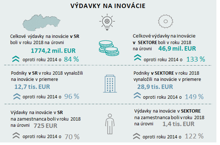 Nemenej dôležité sú výdavky na inovácie. Sektor investuje do inovácií v priemere 28,9 tisíc EUR na podnik, čo je 2-krát viac ako je národný priemer. Celkovo sa sektor podieľa na celkových výdavkoch do inovácií v SR 3 %-ami.