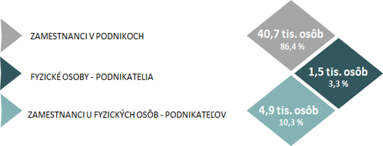 Z celkového počtu 47 tisíc pracujúcich v sektore tvoria 86 % zamestnanci v podnikoch a 3 % tvoria fyzické osoby – podnikatelia. Za posledných 5 rokov sa podiel fyzických osôb – podnikateľov na celkovom počte pracovných síl nezmenil. V SR fyzické osoby – podnikatelia tvoria 13 % pracovnej sily. Sektor patrí medzi 38 % sektorov s najnižším podielom fyzických osôb – podnikateľov na celkovom počte pracujúcich.