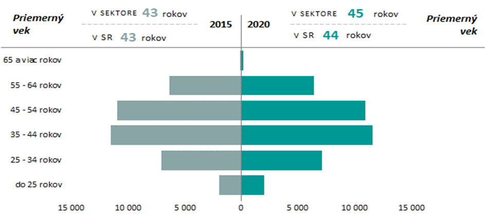 Z hľadiska veku zamestnancov patrí sektor medzi mladšie sektory. Vyšší priemerný vek majú zamestnanci v 54 % sektoroch. Priemerný vek zamestnancov v sektore je o 1 rok vyšší ako v SR. V celej SR má 24 % zamestnancov 55 a viac rokov, v sektore je ich podiel na úrovni 23 %. Ak sektor definujeme podľa sektorových zamestnaní, priemerný vek zamestnancov je tiež na úrovni 45 rokov.
