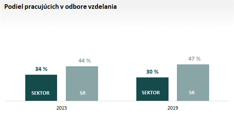 V sektore klesá podiel pracujúcich v odbore vzdelania. V súčasnosti približne 30 % zamestnancov sektora vyštudovalo optimálny odbor vzdelania k vykonávanému zamestnaniu. Pri vysokoškolských zamestnancoch v sektore je to 32 % a stredoškolských 30 %. Z hľadiska sektorovo špecifických zamestnaní vykonáva približne 26 % zamestnancov prácu, na ktorú sa počas štúdia aj pripravovali.