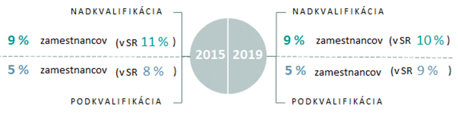 V sektore pracuje približne 9 % zamestnancov na pozícii, na ktorú je postačujúce nižšie vzdelanie a tento podiel stagnuje. V sektore je menej podkvalifikovaných ako nadkvalifikovaných zamestnancov. V porovnaní s úrovňou nadkvalifikácie a podkvalifikácie v SR možno sektor považovať za oblasť s pomerne nízkym podielom zamestnancov s neadekvátnym stupňom vzdelania. V prípade zamestnaní špecifických pre tento sektor má 7 % zamestnancov vyššie vzdelanie ako je vyžadované na výkon práce.