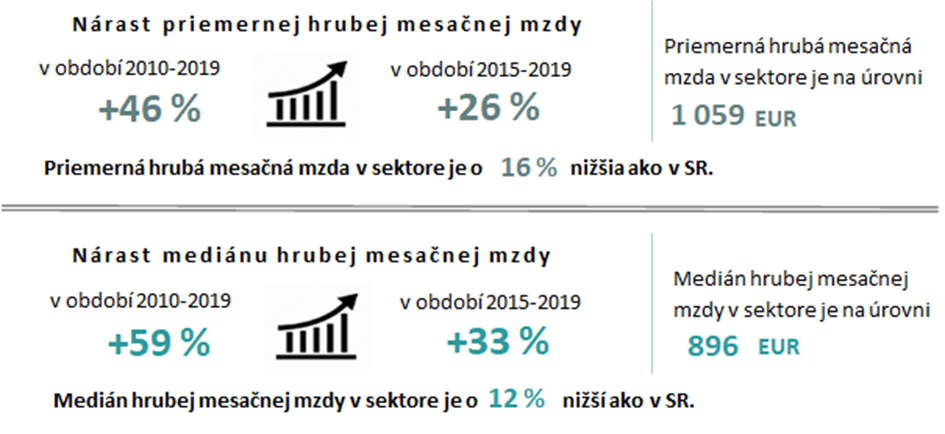 Za uplynulých 10 rokov vzrástli mzdy o 46 %, čo predstavuje 4 %-ný priemerný medziročný rast. Rast miezd v sektore tak vykazuje nižšiu dynamiku ako v podmienkach SR. V zahraničných spoločnostiach v sektore sú mzdy o 34 % vyššie ako v tuzemských.