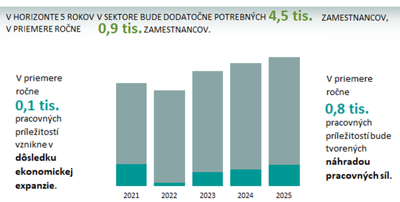 Celková dodatočná potreba ľudských zdrojov v sektore bude v období rokov 2021 – 2025 na úrovni približne 4,5 tisíc osôb. Dodatočná potreba v tomto sektore bude na úrovni 10 % súčasného počtu pracujúcich, t. j. približne ku každému desiatemu pracujúcemu bude potrebné doplniť ďalšiu osobu. Pri analýze dodatočnej potreby pracovných síl je dôležité poznať aj to, akým spôsobom budú na trhu práce vznikať dodatočné pracovné príležitosti. V období rokov 2021 – 2025 bude na tvorbe dodatočných pracovných príležitostí dominovať náhrada pracovných síl, ktorá bude tvoriť v priemere 87 % celkovej dodatočnej potreby. V sektore potravinárstvo tak vznikne v priemere ročne 800 pracovných príležitostí v dôsledku náhrady pracovných síl.