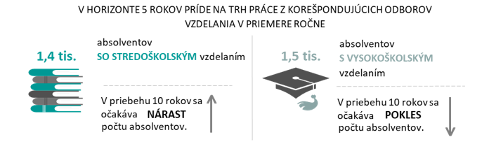 V období rokov 2021 – 2025 príde na trh práce 14,8 tisíc absolventov stredných a vysokých škôl, ktorí ukončia štúdium v niektorom z korešpondujúcich odborov vhodných pre výkon zamestnaní v tomto sektore a nebudú pokračovať v štúdiu. Približne 48 % z prichádzajúcich absolventov budú tvoriť absolventi stredných škôl, podiel absolventov vysokých škôl bude na úrovni 52 %. V dlhšom horizonte, v nasledujúcich desiatich rokoch sa očakáva nárast počtu stredoškolských absolventov.