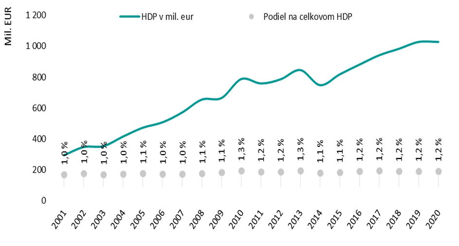 Vývoj HDP v sektore remeslá a osobné služby v mil. EUR a podiel sektora na celkovom HDP v období 2001 – 2020