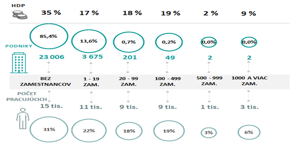 Najvyšší príspevok (35 %) k HDP sektora majú podniky bez zamestnancov. Príspevok tejto kategórie mierne klesá, v roku 2010 bol na úrovni 39 %. Daná veľkostná kategória má v sektore dominantnejšie postavenie ako v SR, kde tvorí 17 % HDP. Najviac pracujúcich je vo veľkostnej kategórii podnikov bez zamestnancov s podielom 31 % na celkovej zamestnanosti sektora. V roku 2010 bol tento podiel na úrovni 30 % a daná veľkostná kategória sa tak stáva významnejšou z hľadiska pracovných síl.