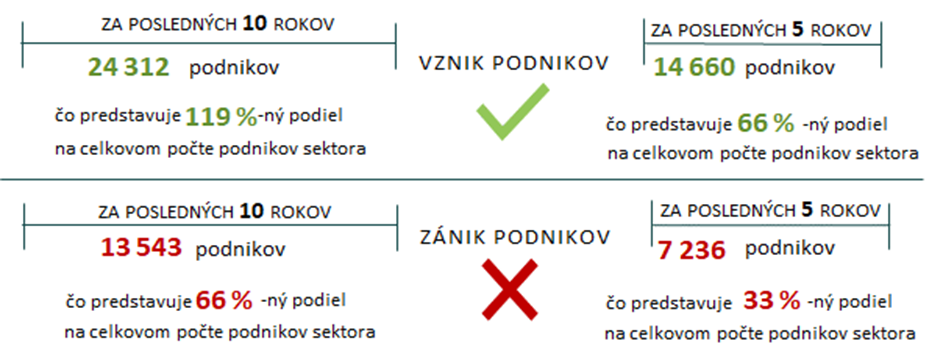 Za posledných päť rokov pripadalo na 100 existujúcich podnikateľských subjektov 66 novovzniknutých a 33 zaniknutých podnikateľských subjektov. V dlhodobom horizonte dynamika vzniku podnikateľských subjektov rastie a rastie aj počet zaniknutých podnikov. V porovnaní so SR sa sektor vyznačuje vyššou dynamikou vzniku a zániku podnikateľských subjektov. Prevažnú časť vzniknutých aj zaniknutých podnikateľských subjektov predstavujú fyzické osoby (ďalej len „FO“) – podnikatelia (86 %).