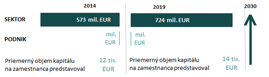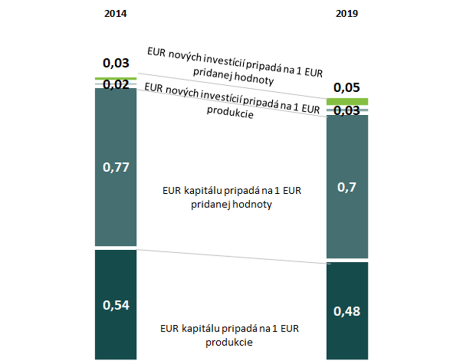 Podniky v sektore potrebujú v priemere kapitál na úrovni 0,48 EUR na tvorbu jedného eura produkcie a 0,7 EUR na tvorbu jedného eura pridanej hodnoty. Klesajúci trend tohto ukazovateľa hovorí o klesajúcom podiele kapitálu na výrobnom procese spoločností, ale súčasne hovorí aj o zvyšujúcej sa produktivite kapitálu (t. j. jednotka kapitálu v minulosti prinášala menší príspevok k tvorbe pridanej hodnoty ako v súčasnosti). Z každého eura realizovanej produkcie používajú spoločnosti na ďalšie investície približne 3 centy (3 %) a na každé euro pridanej hodnoty prislúcha približne 5 centov nových investícií.
