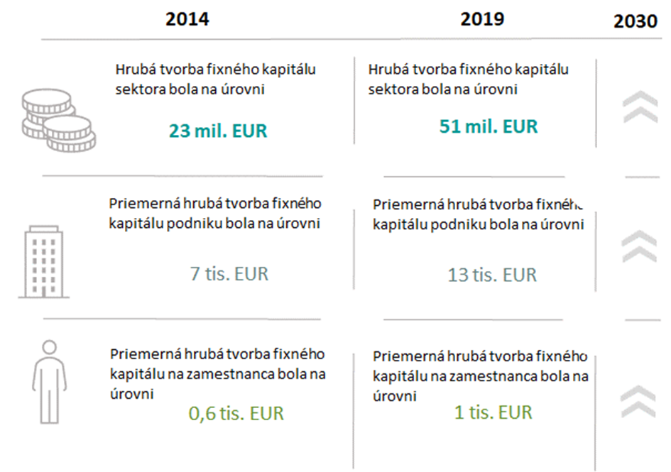 V roku 2019 investovali podniky v sektore o 74,1 % viac ako pred piatimi rokmi. Na jedného zamestnanca pripadali investície vo výške 1 tisíc EUR, čo je o 87 % menej ako na národnej úrovni. Sektor tak má podpriemernú dynamiku investičnej aktivity. Všetky investície smerujú do hmotného majetku. Hlavnou investičnou položkou sú stroje a hnuteľné veci, ktoré tvoria 35 % celkových investícií.