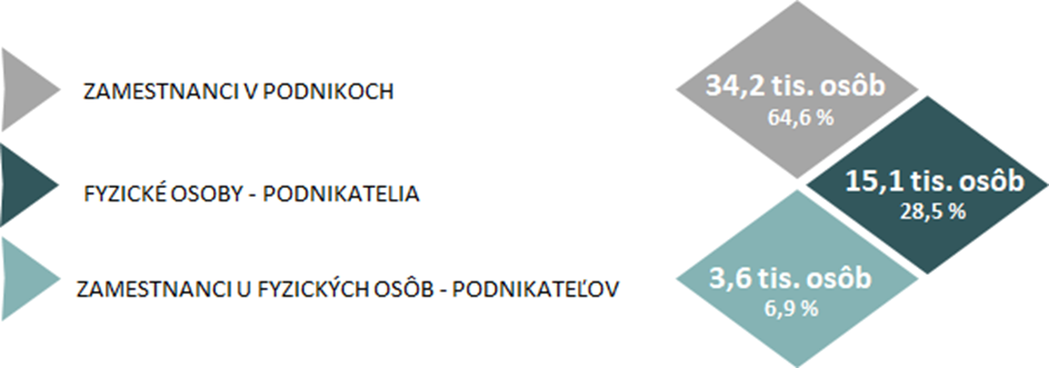 Z celkového počtu 53 tisíc pracujúcich v sektore tvoria 65 % zamestnanci v podnikoch a 29 % tvoria fyzické osoby – podnikatelia. Za posledných 5 rokov poklesol podiel fyzických osôb – podnikateľov na celkovom počte pracovných síl o 4 p. b. V SR fyzické osoby – podnikatelia tvoria 13 % pracovnej sily. Sektor patrí medzi 8 % sektorov s najvyšším podielom fyzických osôb – podnikateľov na celkovom počte pracujúcich.