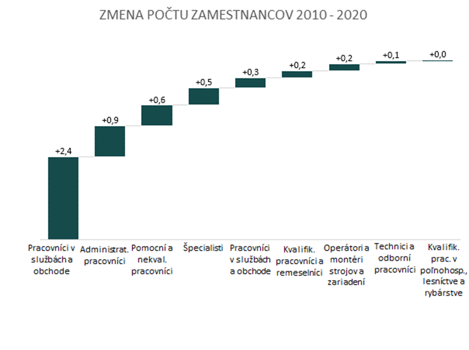 V sektore je podpriemerný podiel pracovných miest s potrebou vysokej kvalifikácie. Z celkového počtu pracovných miest v sektore tvoria 4 % manažérske pozície a pozície pre špecialistov. Ich podiel za posledných 10 rokov vzrástol o 2 p. b. Najviac zamestnancov pracuje v hlavných triedach zamestnaní 5 Pracovníci v službách a obchode a 9 Pomocní a nekvalifikovaní pracovníci, ktoré spolu majú 82 %-ný podiel na celkovej zamestnanosti sektora.