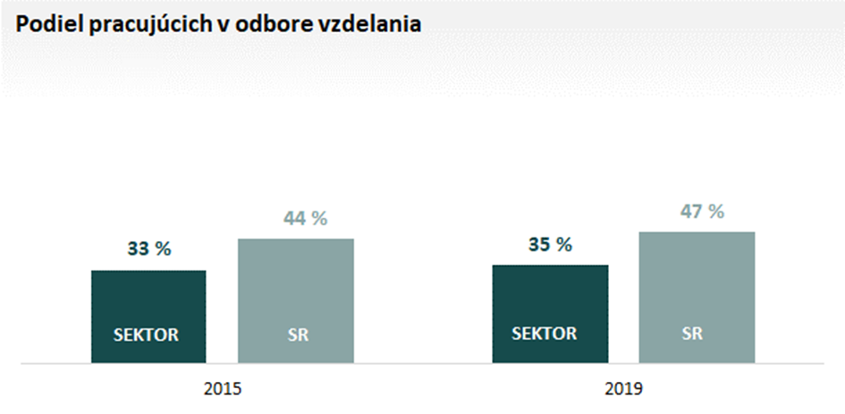 Podiel vysokoškolsky vzdelaných zamestnancov v sektore rastie. Za 8 rokov vzrástol ich podiel o 1 p. b. na súčasných 15 %. Sektor tak patrí medzi 8 % sektorov s najnižším podielom vysokoškolsky vzdelaných zamestnancov, resp. najvyšším podielom stredoškolsky vzdelaných zamestnancov.