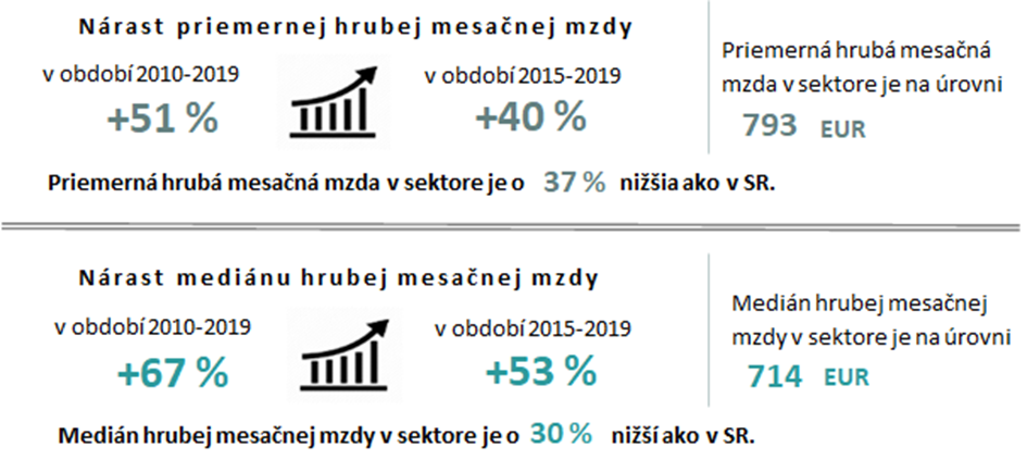 Za uplynulých 10 rokov vzrástli mzdy o 51 %, čo predstavuje 5 %-ný priemerný medziročný rast. Rast miezd v sektore tak vykazuje nižšiu dynamiku ako v podmienkach SR. V zahraničných spoločnostiach v sektore sú mzdy o 42 % vyššie ako v tuzemských.