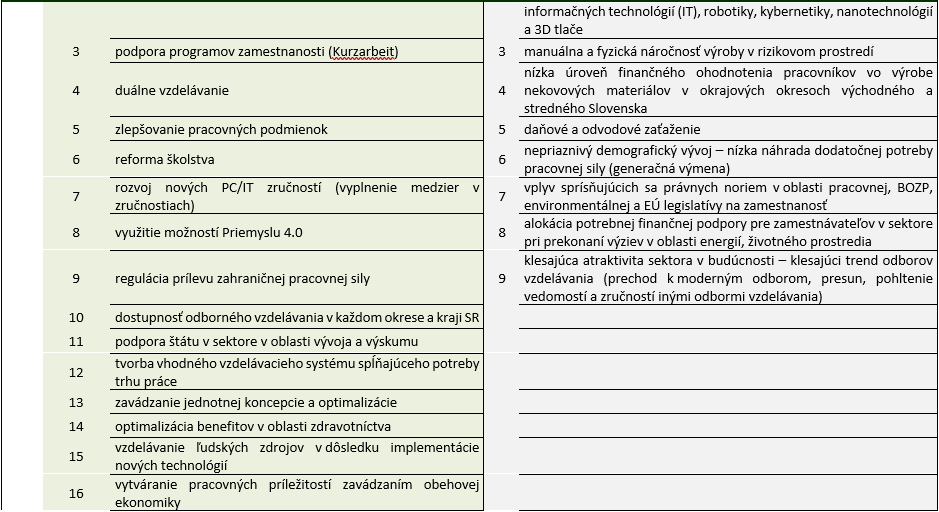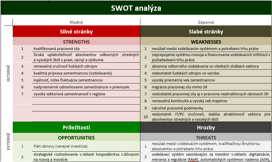 SWOT analýza nadväzuje na PESTLE analýzu, pričom sú v nej sledované vplyvy súvisiace s ekonomickou situáciou, demografickým vývojom, štruktúrou jestvujúcej sústavy vzdelávacích ustanovizní, legislatívnymi podmienkami, technologickými trendmi, globalizáciou a medzinárodnou konkurenciou, úrovňou a intenzitou vedeckej a výskumnej činnosti spojenej so sektorom, resp. vplyvy spojené s inými oblasťami. PESTLE analýzu dopĺňa o hodnotiace úsudky a podrobnejšie posúdenie jednotlivých oblastí navrhnutých v rámci PESTLE analýzy s previazaním na otázky trhu práce a problematiku rozvoja ľudských zdrojov