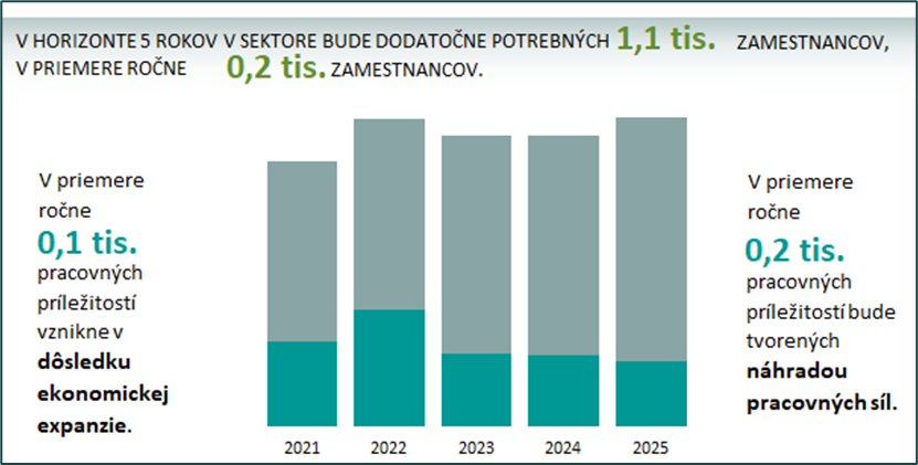 Celková dodatočná potreba pracovných síl v sektore bude v období rokov 2021 – 2025 na úrovni približne 1 100 osôb. Pri analýze dodatočnej potreby pracovných síl je dôležité poznať aj to, akým spôsobom budú na trhu práce vznikať dodatočné pracovné príležitosti. V období rokov 2021 – 2025 bude na tvorbe dodatočných pracovných príležitostí dominovať náhrada pracovných síl, resp. odchod zamestnancov z trhu práce predovšetkým do starobného dôchodku, čo bude tvoriť v priemere 72 % celkovej dodatočnej potreby – ročne približne 200 pracovných príležitostí.