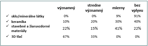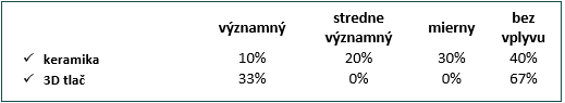 Zhrnutie: Zavádzaním tejto inovácie do výrobného procesu v rámci výroby keramiky a 3D tlače sa z celkového počtu 13 zamestnaní predpokladá zmena v rámci odborných spôsobilostí pri siedmich zamestnaniach a šesť zamestnaní inovácia neovplyvní.