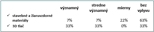 Zhrnutie: Zavádzaním tejto inovácie do výrobného procesu v rámci výroby stavebných a žiaruvzdorných materiálov a 3D tlače sa z celkového počtu 30 zamestnaní predpokladá zmena v rámci odborných spôsobilostí pri 12-tich zamestnaniach a 18 zamestnaní inovácia neovplyvní.