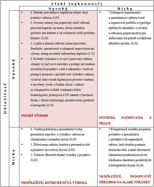 | 9. Vlastný výskum a vývoj nových metodík a postupov pre riadenie investičných projektov a diel zákazníkov, budovanie prístupu k presnosti a spoľahlivosti výsledkov sektora, využívanie rozsahu digitalizácie procesov riadenia a stavebnej výroby, dobrá technologická, prístrojová a SW interná vybavenosť firiem v oblasti geodézie a kartografie | 4 | 0,05 | 0,1 | 0,25 |