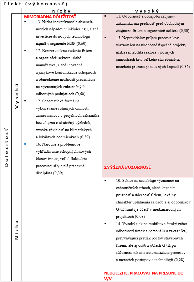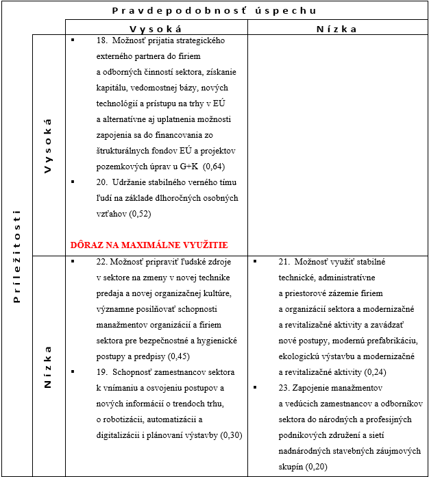 | 21. Možnosť využiť stabilné technické, administratívne a priestorové zázemie firiem a organizácií sektora a modernizačné a revitalizačné aktivity a zavádzať nové postupy, modernú prefabrikáciu, ekologickú výstavbu a modernizačné a revitalizačné aktivity | 2 | 0,12 | 0,24 | 0,6 |
