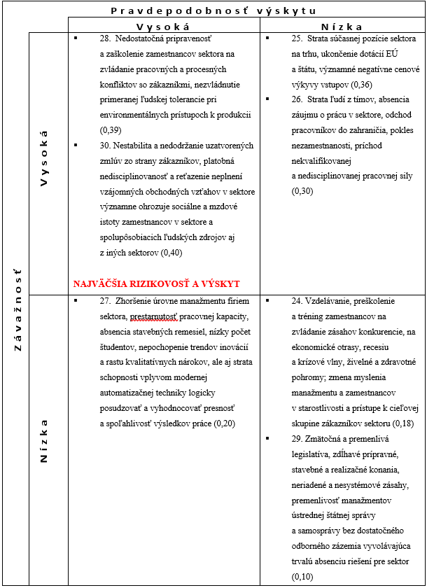 | 27. Zhoršenie úrovne manažmentu firiem sektora, prestarnutosť pracovnej kapacity, absencia stavebných remesiel, nízky počet študentov, nepochopenie trendov inovácií a rastu kvalitatívnych nárokov, ale aj strata schopnosti vplyvom modernej automatizačnej techniky logicky posudzovať a vyhodnocovať presnosť a spoľahlivosť výsledkov práce. | 2 | 0,1 | 0,2 | 0,5 |