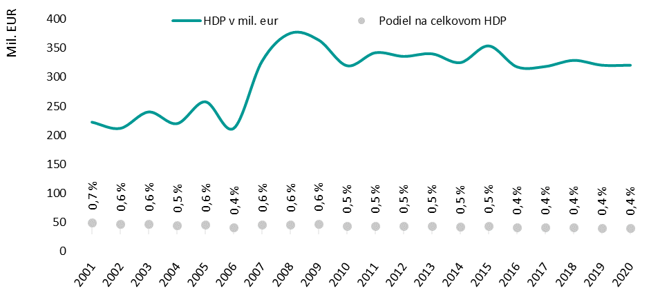 Sektor má v súčasnosti 0,4 %-ný podiel na tvorbe HDP v SR a tento podiel z dlhodobého pohľadu mierne klesá. Z hľadiska tvorby HDP tak patrí medzi top 5 % sektorov s najnižším príspevkom k tvorbe HDP.