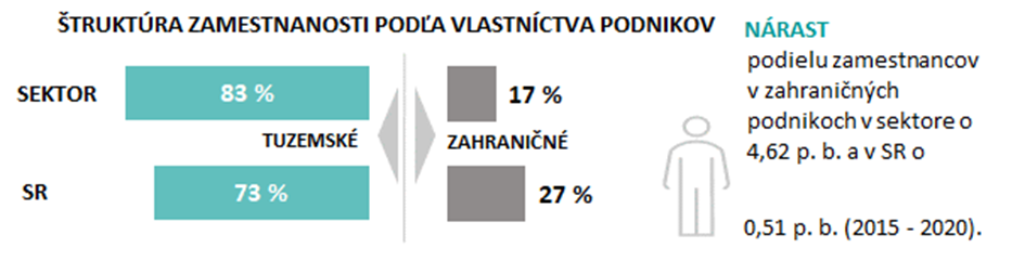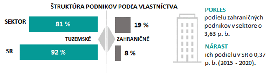 V sektore dominujú tuzemské podniky s 81 %-ným zastúpením a 83 %-ným podielom na zamestnanosti sektora. V sektore tak pracuje menšia časť zamestnancov v zahraničných podnikoch ako v slovenských podnikoch.  V porovnaní s rokom 2015 klesol podiel zahraničných podnikov v sektore  o 3,6 p. b. a záujem zahraničných investorov klesá.