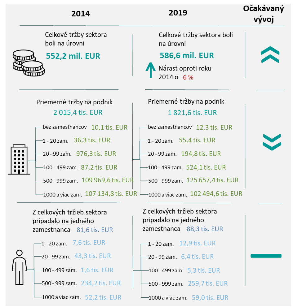 V roku 2019 mali podniky v sektore ťažba a úprava surovín, geológia celkové tržby vo výške 586,6 mil. EUR, podnikateľské subjekty (vrátane fyzických osôb – podnikateľov) mali v priemere 1 821,6 tisíc EUR tržieb. V porovnaní s ostatnými sektormi, podniky v sektore majú pomerne vysoké tržby. Najvyššie tržby (v prepočte na podnik) majú podniky s 500 – 999 zamestnancami, ktoré majú priemerné tržby na úrovni takmer 125 658 tisíc EUR. V podnikoch s 1 000 a viac zamestnancami od roku 2014 vzrástli tržby na zamestnanca o 13 %. Najvyššie priemerné tržby mali podniky v divízii 5 Ťažba uhlia a lignitu (v priemere 23 217 tisíc EUR na podnik).