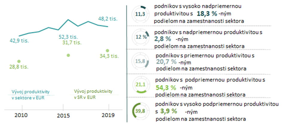 Sektor má v SR o 42 % nižšiu produktivitu práce ako v EÚ a patríme medzi 41 % krajín EÚ s najnižšou produktivitou práce v tomto sektore. Najvyššia produktivita práce sektora je v krajinách Holandsko, Dánsko a Švédsko kde je o 524 % až 1 758 % vyššia ako v SR.