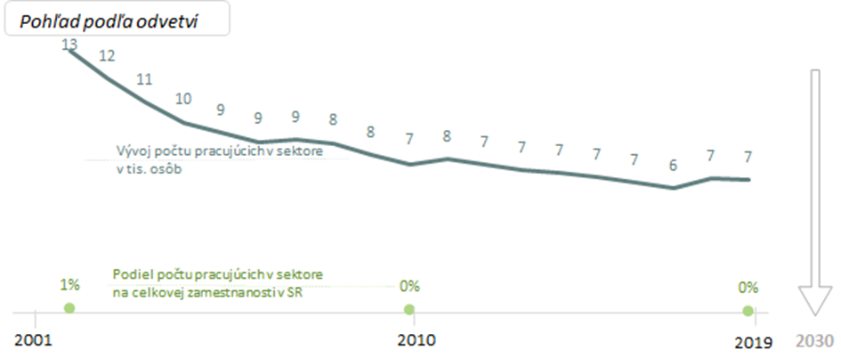 V sektore v súčasnosti pracuje o 49 % menej osôb ako pred 20 rokmi a na celkovej zamestnanosti v SR sa sektor podieľa 0 %. Tento podiel sa v porovnaní s rokom 2001 nezmenil. Priemerný medziročný pokles zamestnanosti v sektore je na úrovni 4 %. Najvyšší medziročný pokles počtu pracujúcich za posledných 20 rokov zaznamenal sektor v roku 2002 (o 11 %). Do roku 2030 sa očakáva pokles počtu pracovných síl. Najväčšími zamestnávateľmi v sektore sú Hornonitrianske bane Prievidza, a.s. v skratke HBP, a.s., Slovenské magnezitové závody, akciová spoločnosť, Jelšava, v skratke SMZ, a.s. Jelšava a NAFTA a.s., ktorí zamestnávajú 59 % zamestnancov sektora. Hornonitrianske bane Prievidza, a.s. idú do štátom nariadeného útlmu.